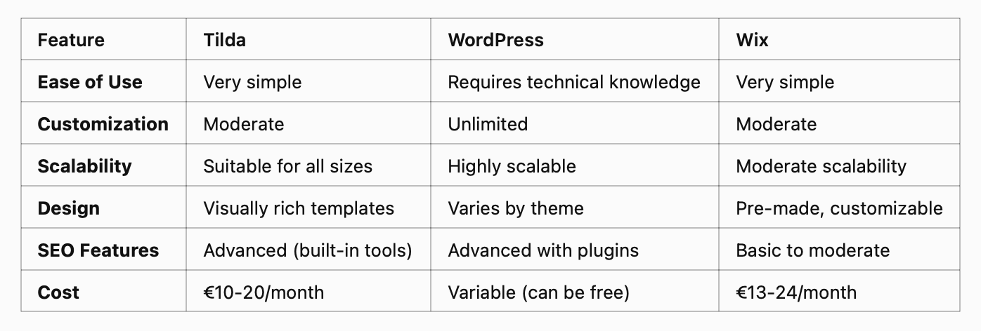 Choosing the right platform depends on your business size, technical skills, and website requirements. Tilda stands out for its intuitive SEO integration and design capabilities, making it ideal for businesses of all sizes. WordPress offers unmatched flexibility for advanced users, while Wix provides a simple, all-in-one solution for smaller projects. Assess your needs and choose the platform that will help your business thrive.